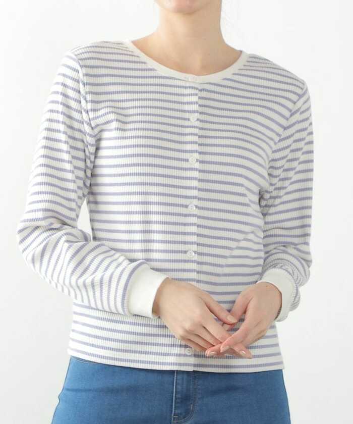 伸縮性のあるテレコ生地のカーディガンです。前後2WAYで使うことができるアイテムで、下の写真のようにトップスとして活用することもできます。