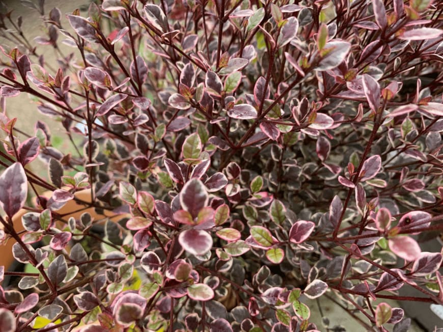 ピンクやパープルの小さな葉が可愛らしいロフォミルタス・マジックドラゴン。葉がたくさん茂りますが、スッキリとした雰囲気のお洒落な常緑低木です。