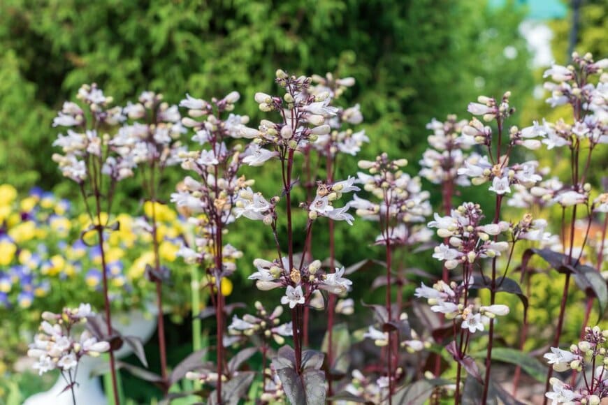 小さなラッパのような薄くピンクがかった白い花を咲かせるペンステモン・ハスカーレッド。銅葉カラーの葉と茎がとてもお洒落で、花とのコントラストも楽しめます。