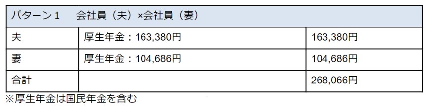 パターン1は夫婦2人が会社員であった場合です。2人で約26万8000円となり、4パターン中1番高い受給額です。