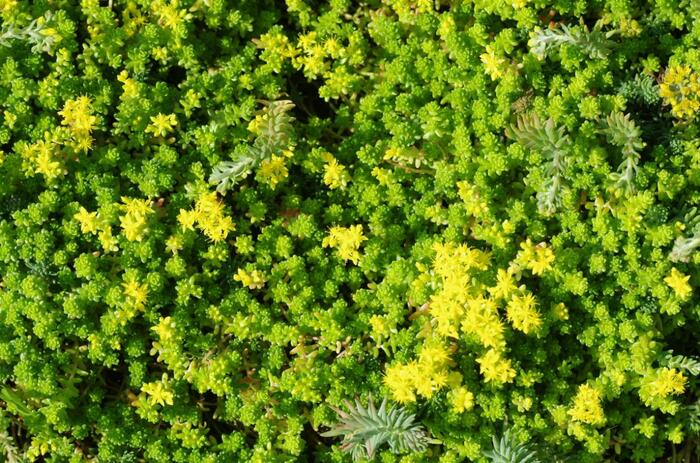 メキシコマンネングサは道端などでもよく見かけるなじみ深いセダム。強健で常緑なので漢字で「万年草」と表記されます。