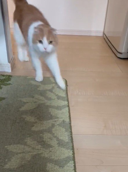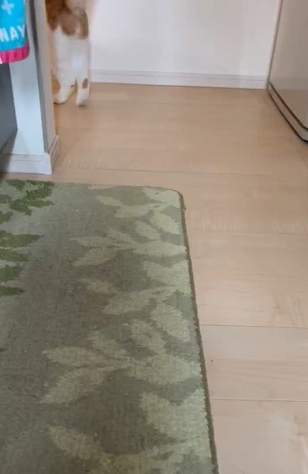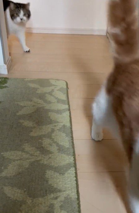 そして奥には、同居猫の「おにく」くんもいたようです。とろくんに続き、軽快なステップで飼い主さんの方へ向かうおにくくん。「ちゅ~る……!」といった心の声が聞こえてきそうな、素早い仕草がチャーミングです!