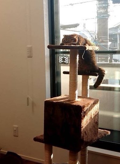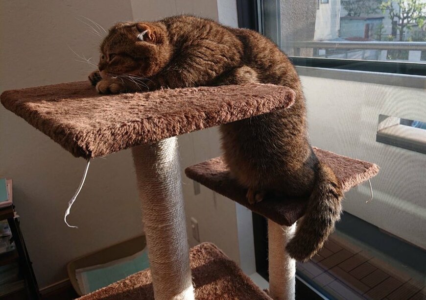 写真には、窓に背中を向けながら、キャットタワーの段差を器用に使って日光浴をするたぬ吉くんの姿がおさめられています。