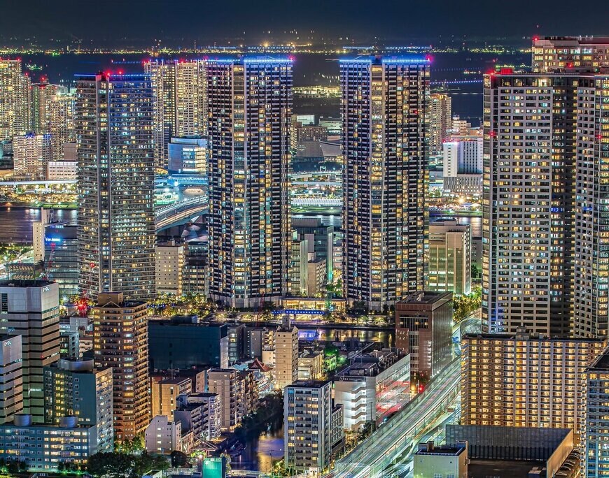東京都港区にて撮影されたこちらの夜景写真。写真に写るビル群は、きらびやかな光を放っており、夜の街を彩っています。思わず息を呑むほどの美しい光景ですね。