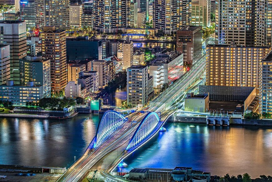 ブルーにライトアップされた中央の橋が、都市の夜景の魅力を際立てています。きらびやかな夜の街への入口になっている橋の存在は、物語の舞台であるかのようで想像力を掻き立ててくれますね。