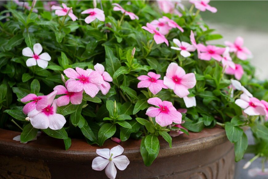 ニチニチソウは暑さにも負けず、たくさんの花を咲かせる強健な性質の一年草です。世話は水やりと花ガラ摘みくらいで、手間がほとんどかかりません。