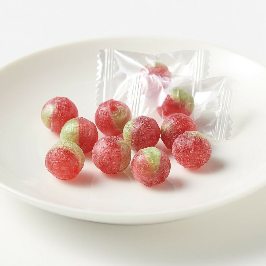 こちらはトマトのような見た目がかわいい飴です。スイカの飴と一緒に並べるとよりかわいいです。こちらも飴職人による手作業でヘタの模様が作られています。本物のトマトと同じように、1つとして同じ見た目のものがないのが魅力です。
