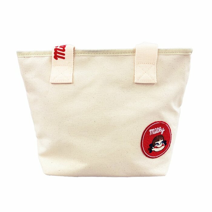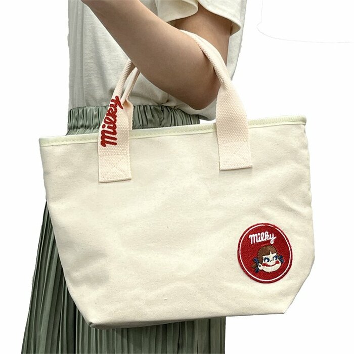 シンプルなアイボリーのキャンパス生地に、ペコちゃんの丸いワッペンがあしらわれたトートバッグです。持ち手部分には「milky」とロゴが入っており、さりげなくおしゃれな雰囲気も感じられます。裏地とポケット付きのしっかりとしたつくりのため、長く愛用しやすいでしょう。