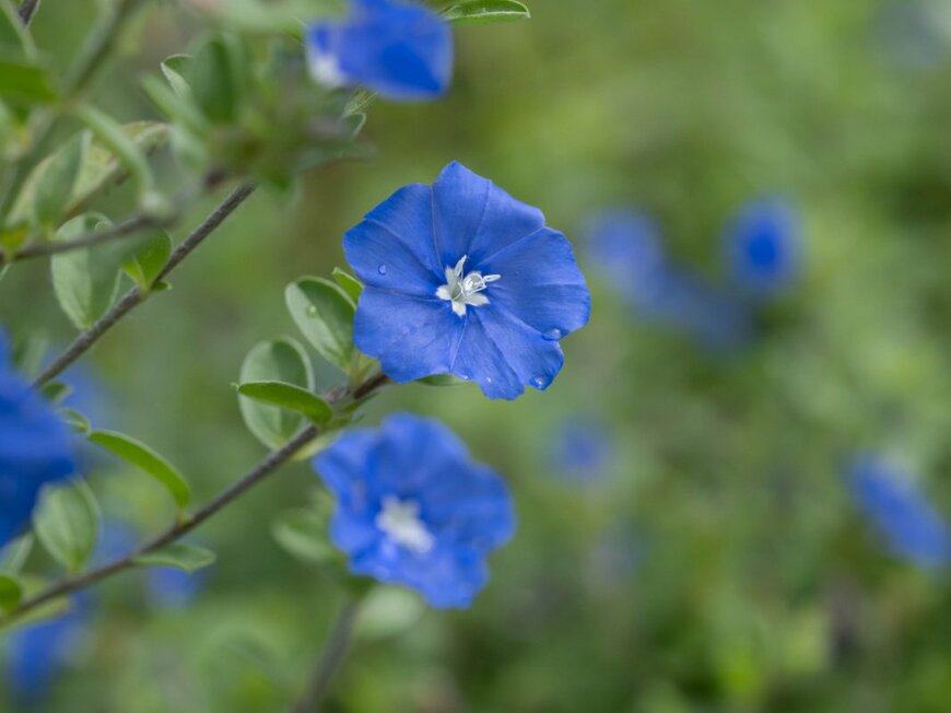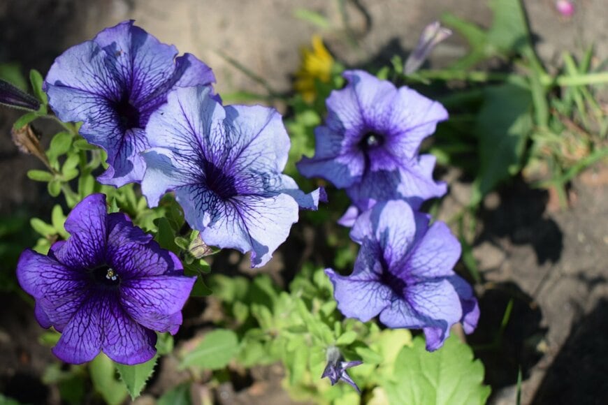 ペチュニアの足元にはブルーの花が咲くエボルブルスや、淡いパープルの花が咲くバコパ、あるいは斑入りのグリーン系リーフプランツなどを植えてみます。後方にはサルビアなど、草丈の高い草花を配置します。