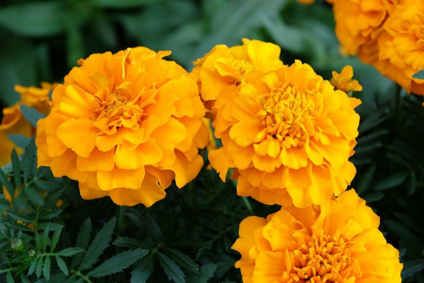 メインの花にはマリーゴールドやジニア、ガザニア、ナスタチュームなど、イエローやオレンジ色の花を植えてみます。花形が異なる植物を一緒に植えることで、目線が動き、賑やかな雰囲気を感じやすくなります。
