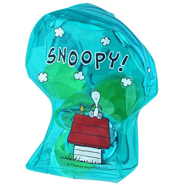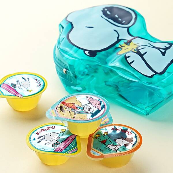 ちょこんと座るスヌーピーの形のクリアポーチにオレンジ味ゼリーが5個入っています。使いやすいサイズ感で、これからのシーズンにぴったりなクリア素材。化粧ポーチとしてはもちろん、プールやジムなど、濡れる可能性があるシチュエーションのときの小物入れにも役立ってくれそうです