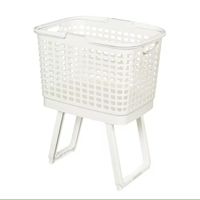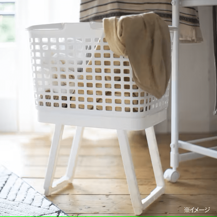 底に収納式スタンドがついた「高さが変えられる腰らくバスケット」。スタンドを広げるだけで、高さがアップします。楽な姿勢で洗濯物を出し入れできて、腰への負担が軽減。洗濯の時短にもつながります。