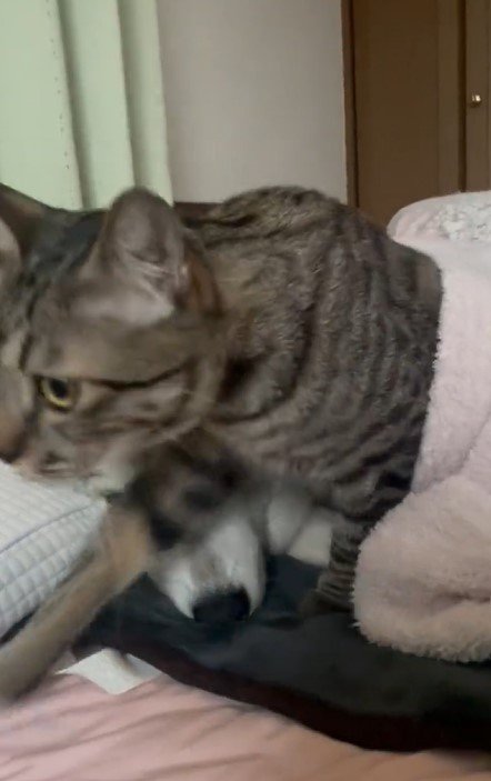 しばらくすると「ヒョコッ」と身体を動かし、布団の外へ歩き始めたサンくん。ユキちゃんはサンくんの仕草に動じることはなく、終始落ち着いた雰囲気で横になっています。