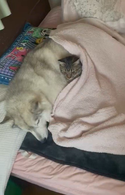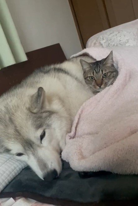 親子のような関係のワンちゃんと猫ちゃんが、一緒にお布団に包まれ幸せそうにする様子がTwitterで注目を集めています。