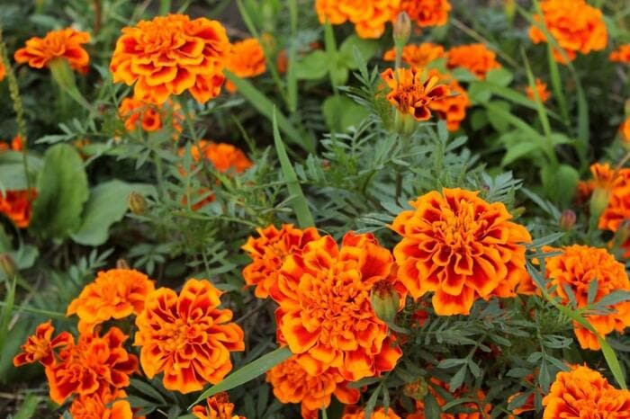 ビタミンカラーの花の代表格ともいえるマリーゴールド。黄色やオレンジ、赤などの元気な花を咲かせ、玄関前を明るく彩ってくれます。