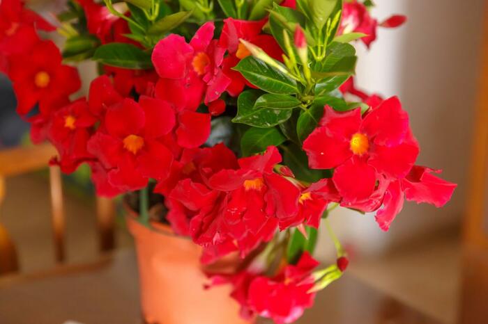 ツタ植物を支柱やフェンスに絡ませ、空間を飾るのもステキな演出方法。さまざまなツタ植物があるなかでも、真っ赤な花色が魅力のマンデビラは玄関をスタイリッシュに彩るのにピッタリな花です。