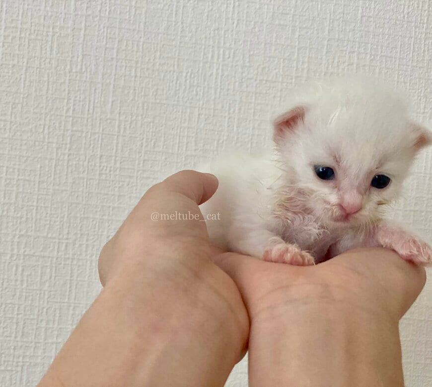1枚目に写っているのは、保護されて間もないころと思われるマオくんの姿です。手のひらにおさまるほどのサイズだった、小さなマオくん。懸命にお顔を上げて一点を見つめる姿に、思わず心を打たれてしまいます。