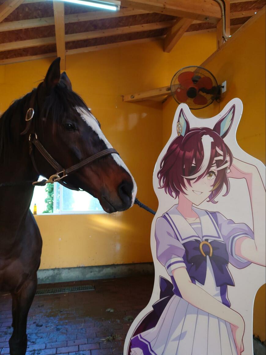 コメント通り、現実世界のタニノギムレットとウマ娘に登場するタニノギムレットの等身大パネルが収められています。
