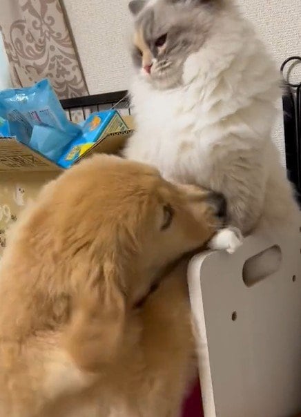 注目を浴びているのは猫の「お茶子」ちゃんと、犬の「つゆ」ちゃん。つゆちゃんは、同居するゴールデンレトリバーの「ぷぅ」ちゃんから生まれた子犬さんです。