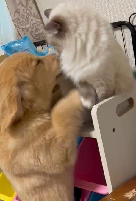 「お互いに遊びたい」子犬と猫のたわむれ姿が話題