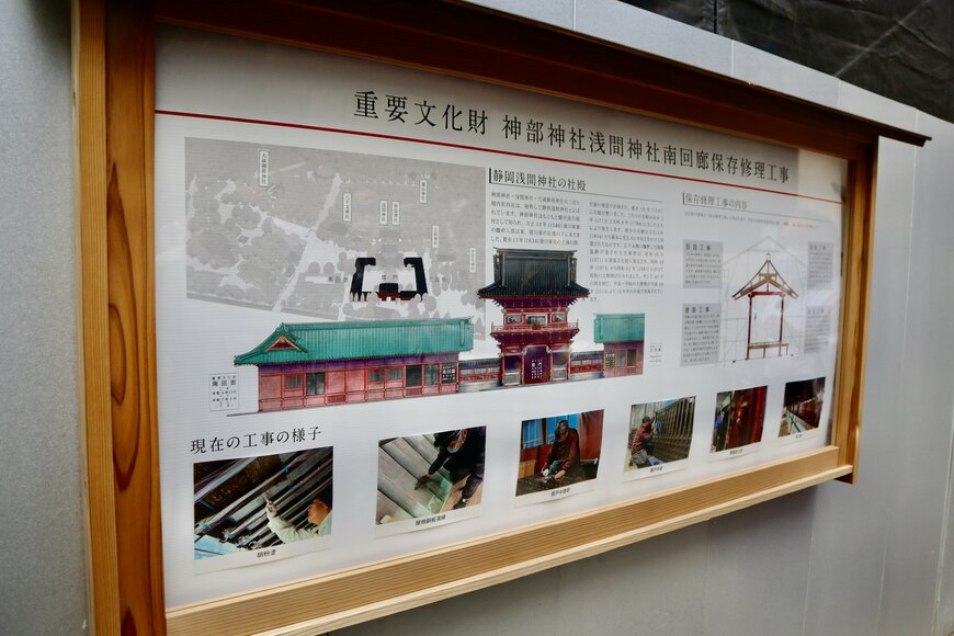 現在、「平成・令和の大改修」を実施しており、重要文化財「神部神社・浅間神社の楼門」の漆・彩色の塗り替え工事が2年ほど前に竣工。漆の使用量は約1トン、工事費は約4億円ほどで、40年ぶりに美しい姿を取り戻しています。
