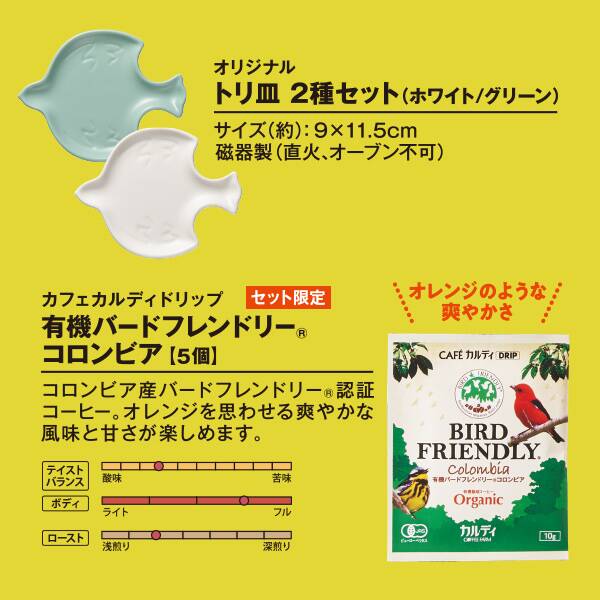 - セット内容:トリ皿(グリーン・ホワイト)、カフェカルディドリップ 有機バードフレンドリー(R)コロンビア(5P)