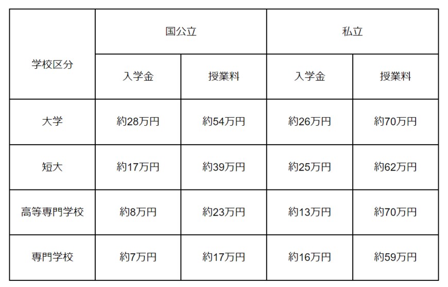たとえば大学私立の場合は入学金で約26万円、授業料で約70万円です。