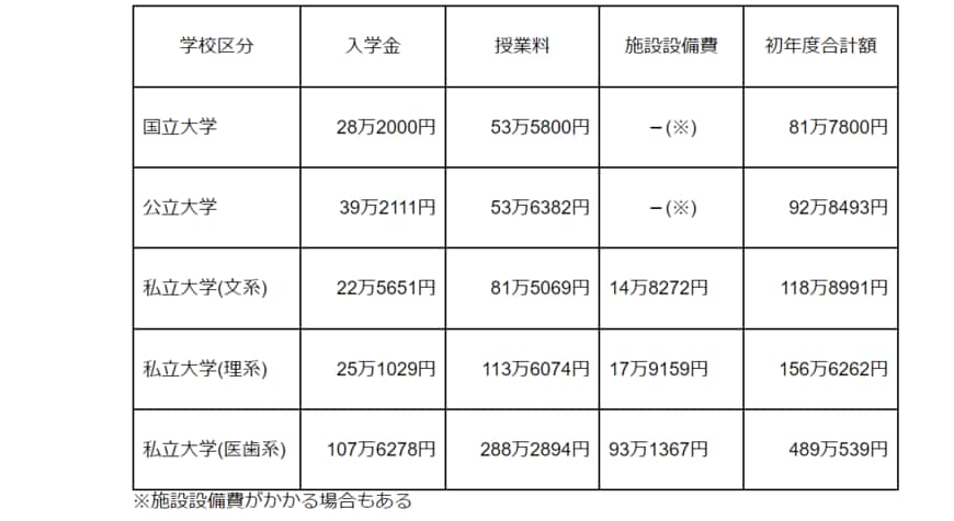 初年度納入金は、国立大学が最も安く約82万円で、私立大学(医歯系)が最も高額で約490万円かかります。