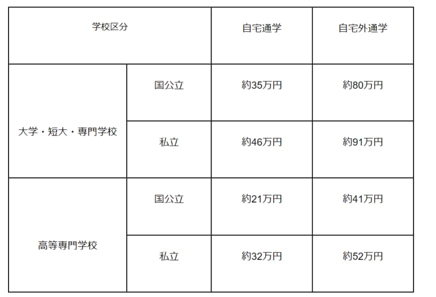 たとえば大学私立で自宅外通学の場合、約91万円です。