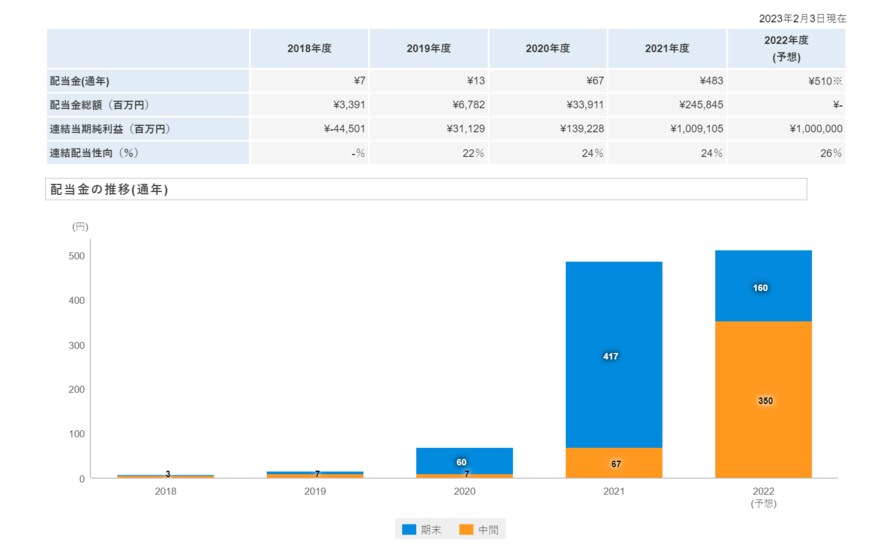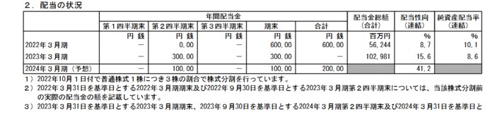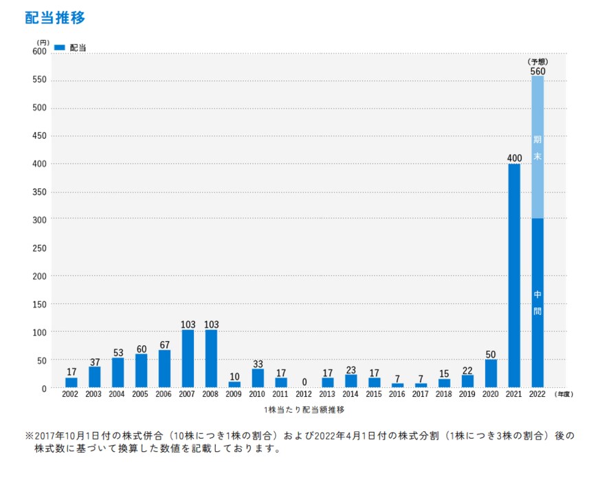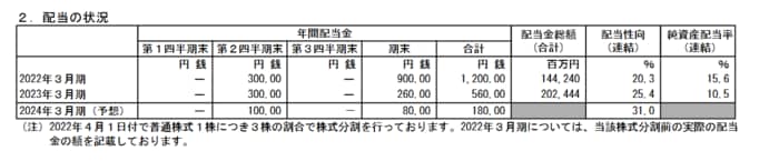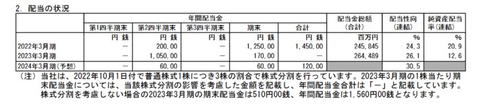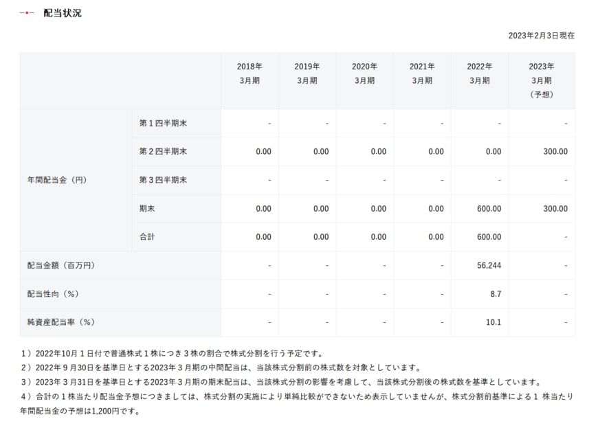 2022年10月1日付で普通株式1株につき3株の割合で株式分割を行ったため、2023年3月期の中間配当は当該株式分割前の株式数を対象、2023年3月期の期末配当は当該株式分割後の株式数を基準としている。なお、合計の1株当たり配当金予想については株式分割により単純比較ができないため非表示だが、株式分割前基準による1株当たり年間配当金の予想は1200円。
