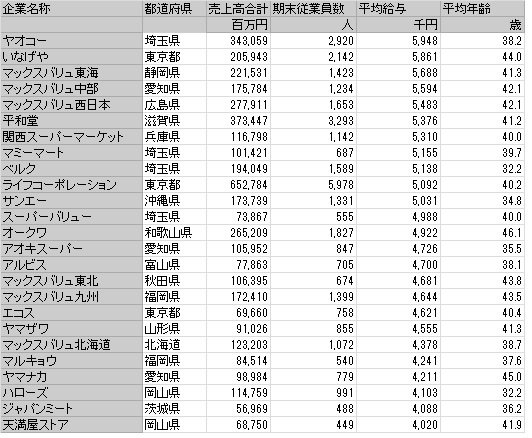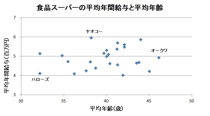 25社の単純平均による平均年齢は40.0歳で、平均年収は490万円となっています。また、各社の従業員数で加重平均した平均年齢は40.1歳で、平均年収は512万円です。加重平均での平均年収が高めに出ているのは、従業員数が多く平均年収が高いヤオコー、いなげやなどの寄与によるものです。