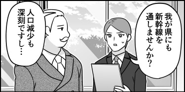 「とある田舎の県知事」というコメントとともに投稿されたのは、人口減少に悩まされているとある田舎の県知事が、新幹線の開通について部下の男性と話をしているシーンを綴った5コマ漫画でした。