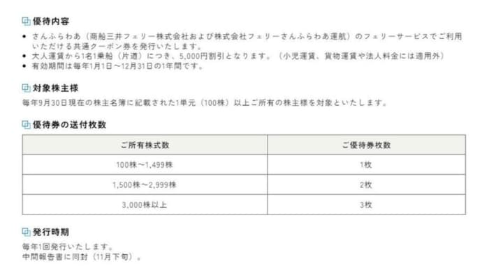 また9月期にフェリーサービス「さんふらわあ」の優待割引券も提供しています。株数に応じて、毎年1月1日~12月31日の1年間、大人運賃から1名1乗船(片道)につき、5000円割引となります。