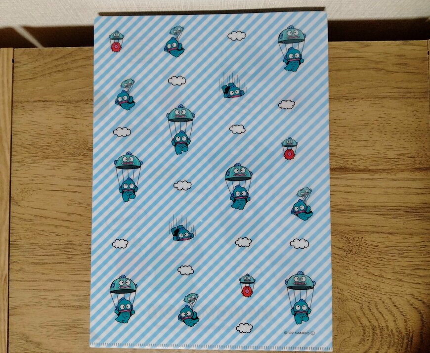 両面仕様のクリアファイルとなっていて、裏面は写真のようなデザインとなっています。たくさんのハンギョドンがパラシュートで空を漂っています。よくみると落ちそうになっているハンギョドン(中央)もいて、かわいらしいです。