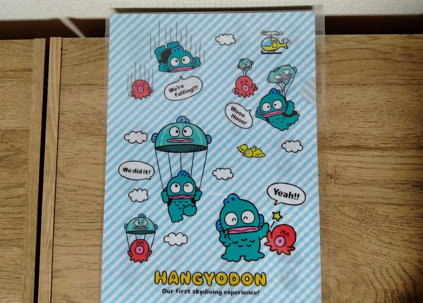 こちらはパラシュートで遊んでいるハンギョドンデザインのクリアファイルです。パラシュートもハンギョドンのデザインとなっています。