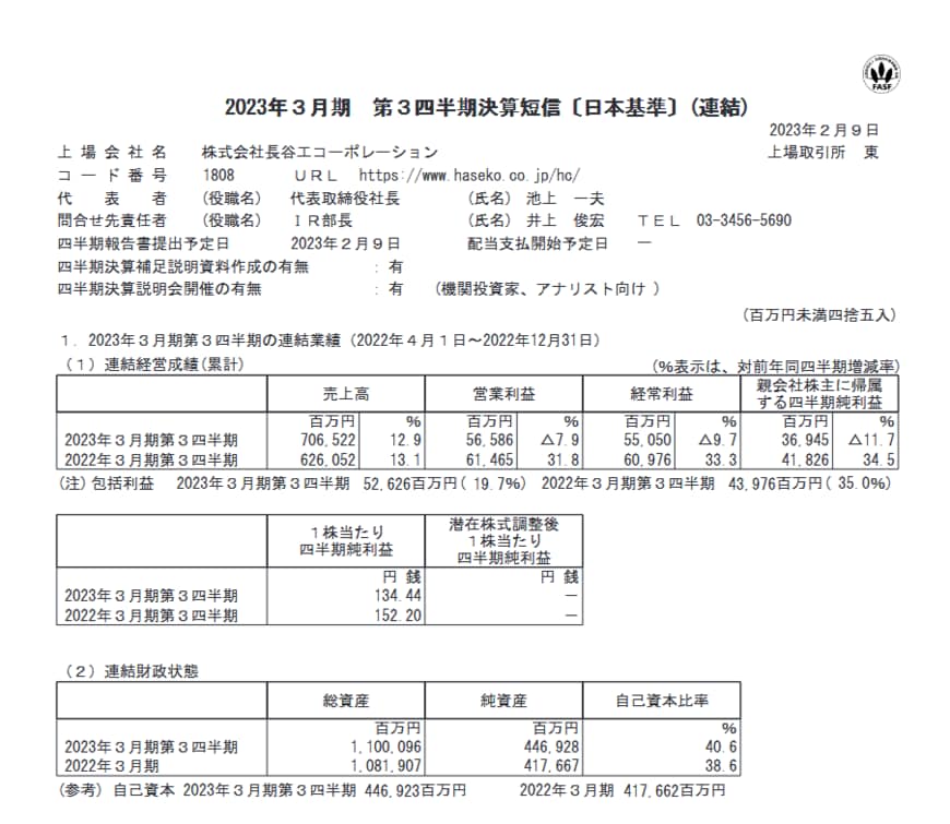 出所:株式会社長谷工コーポレーション「2023年3月期 第3四半期決算短信〔日本基準〕(連結)」