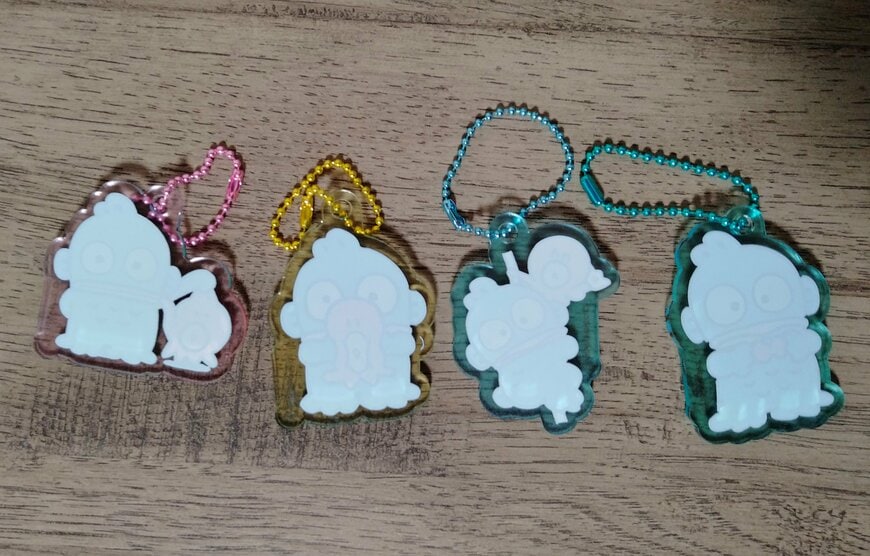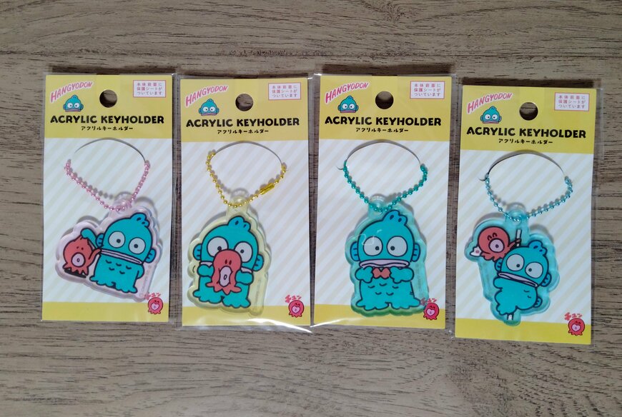 こちらがセリアで販売されている「ハンギョドンデザインのアクリルキーホルダー」です。写真のように4種類あります。さゆりちゃんのイラスト付きのパッケージもかわいらしいです。