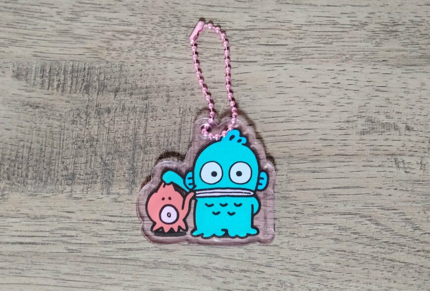 こちらはピンク色のアクリルキーホルダーです。さゆりちゃんと肩を組んでいるハンギョドンがかわいいデザインとなっています。サイズは約横5.5cm×高さ5cm(筆者実測値)です。
