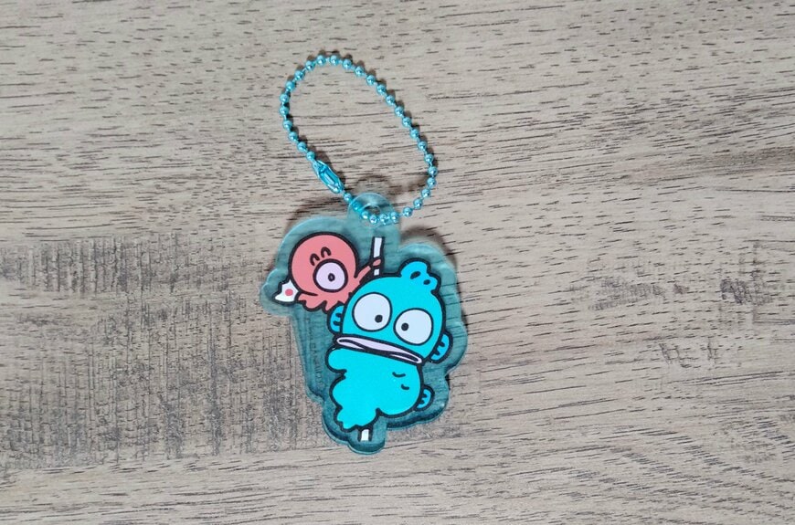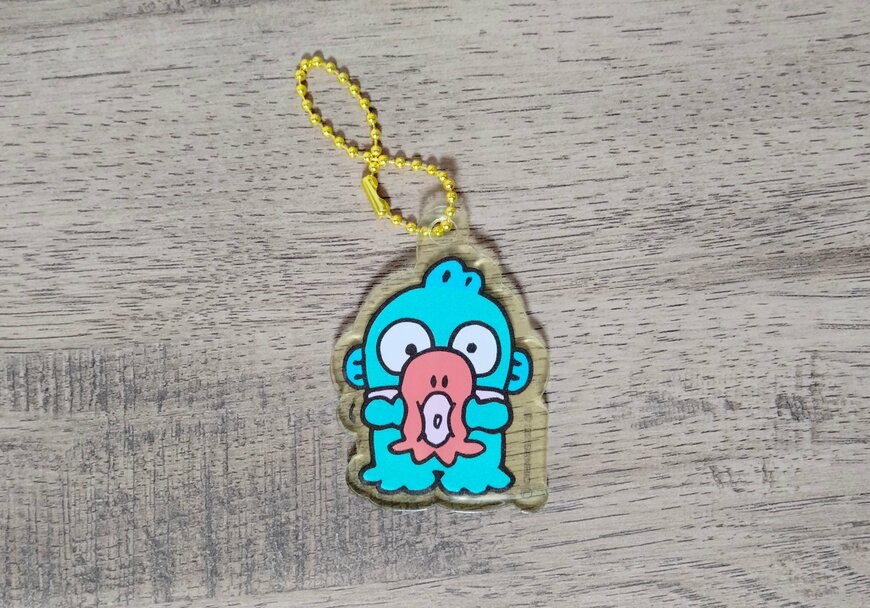 こちらはブルーのアクリルキーホルダーです。棒にのぼっているハンギョドンとさゆりちゃんデザインです。躍動感あるキーホルダーです。サイズは約高さ6cm×横4.5cm(筆者実測値)です。