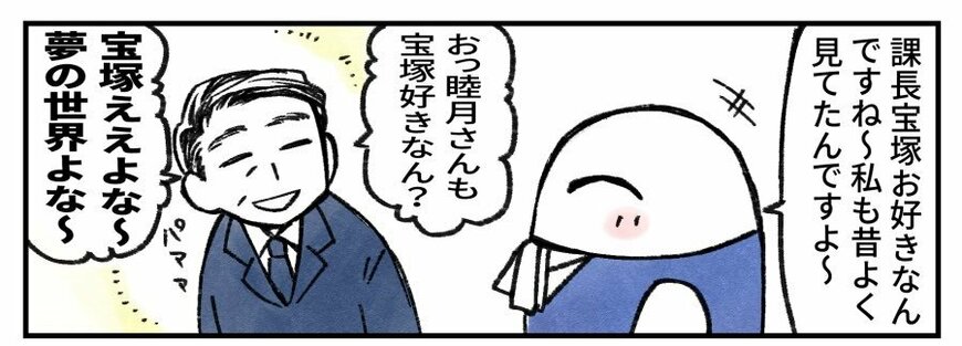 「職場の上司が宝塚好きと判明した漫画」というコメントとともに投稿されたのは、ある日の職場の上司との雑談を綴った4コマ漫画でした。