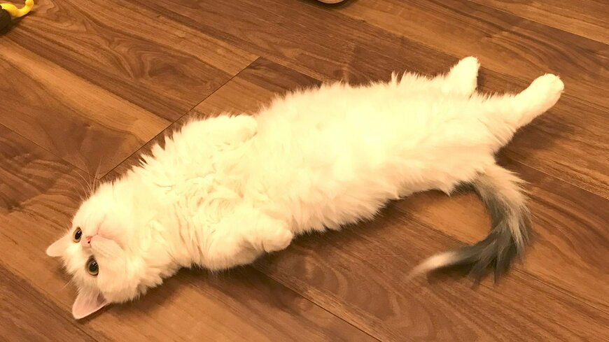 飼い主さんがたぬ吉くんの写真を撮影しようとしたら、写り込んできたというゆきおくん。モフモフのおなかを惜しげもなく見せながら、見事な「ヘソ天ポーズ」をきめています。