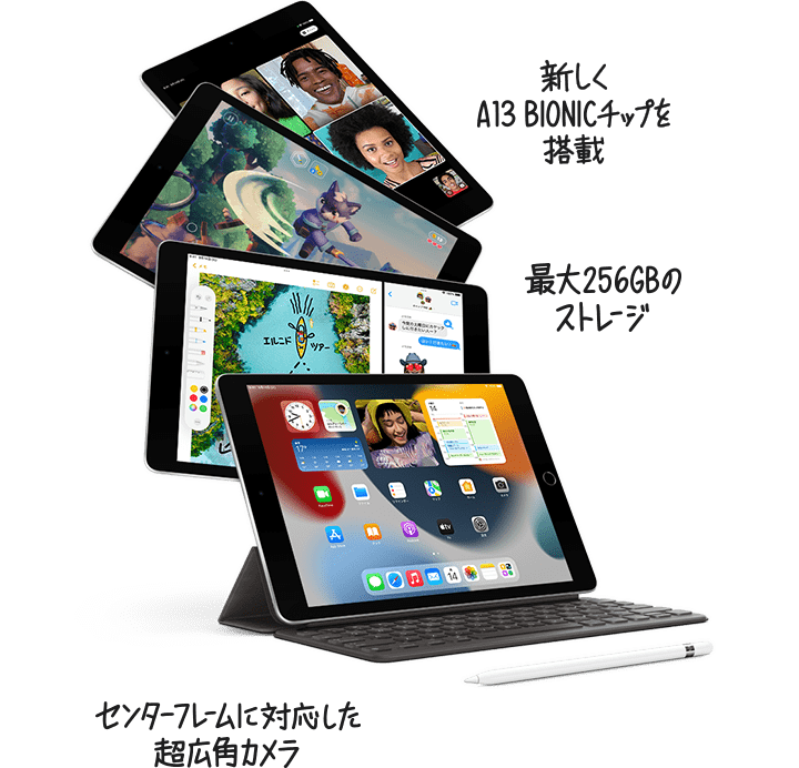 iPad(第9世代)のプロセッサーは、iPhone11などにも搭載されているA13 Bionicチップです。処理能力は1世代前より約20%向上しており、エンターテイメントから仕事まで幅広い用途で十分なパフォーマンスを発揮します。