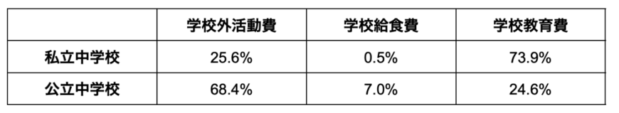 上記は、学校外活動費・学校給食費・学校教育費すべてを含めた費用であり、それぞれの割合は下記のとおりです。