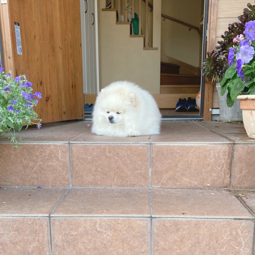 話題になったのは白ポメラニアンの「ちくわ」ちゃん。写真に写るちくわちゃんは、玄関から微動だにせずくつろいでいる様子ですが……?