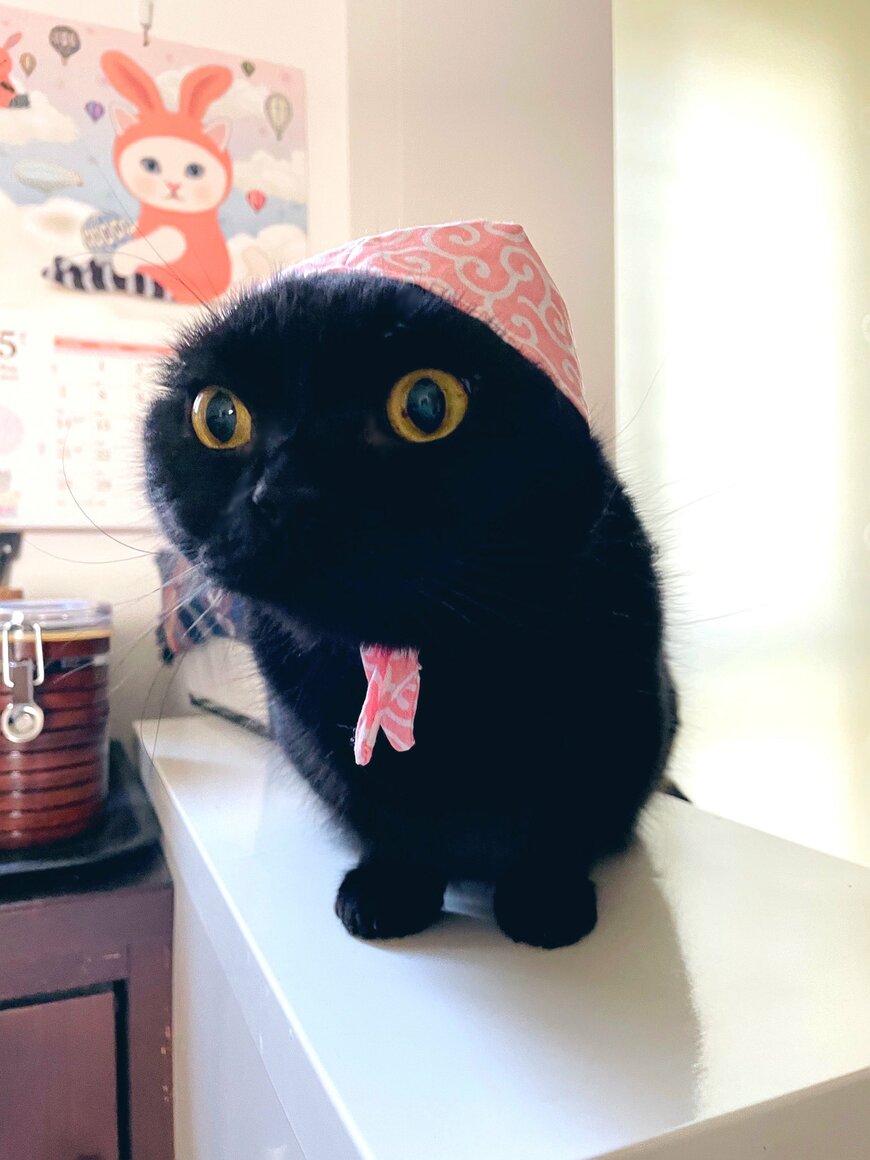 話題になったのは黒猫の「くろよ」ちゃん。写真に写るくろよちゃんは、されるがままに被り物をかぶっているといった様子ですが……?
