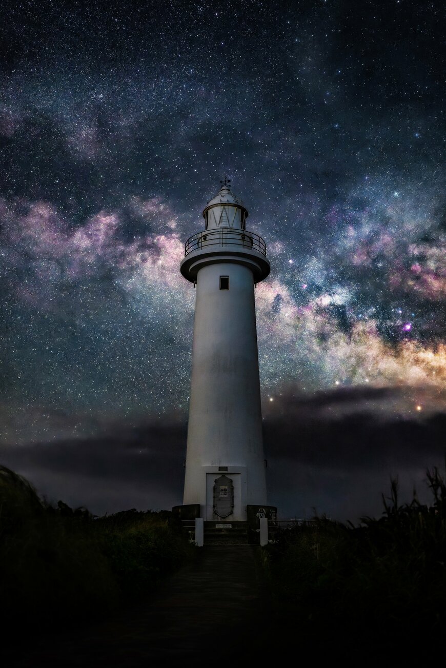 満天の星空を背景にそびえ立つ灯台。鮮やかな星々の光も相まって、その様子はどこか神秘的な様相を見せています。