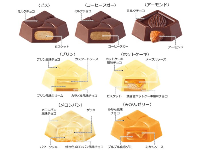 - 種類:14個入り(ビス、コーヒーヌガー、アーモンド、プリン、ホットケーキ、メロンパン、みかんゼリー×各2個)