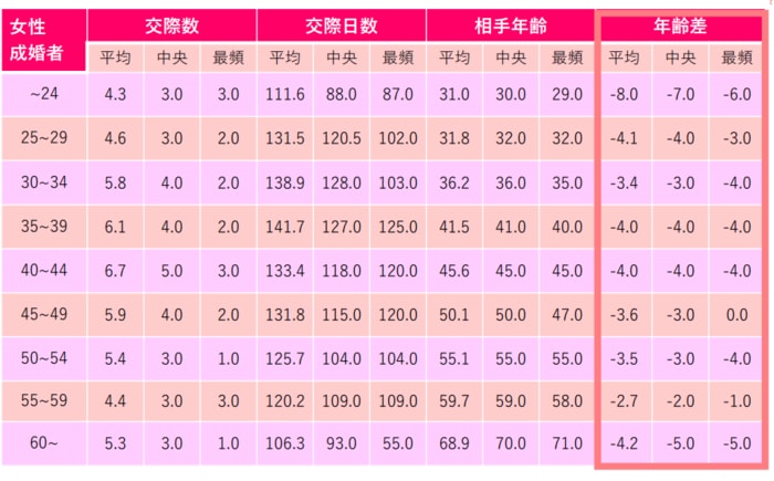 上記の表によれば、45歳半ばから59歳までは成婚した男女の年齢差が特に小さい点も着目点といえるでしょう。