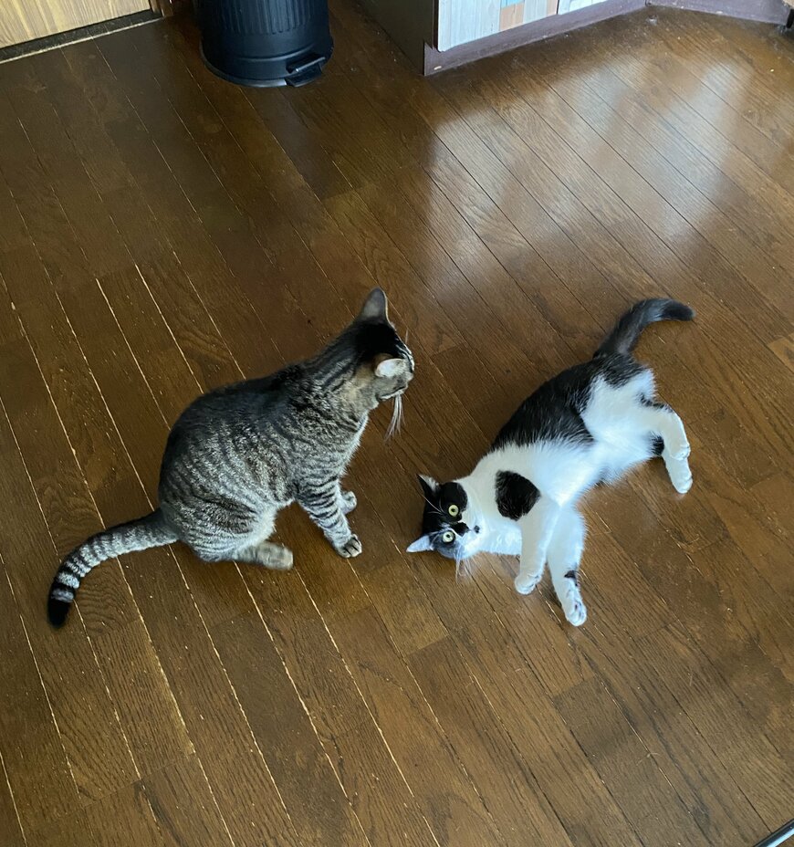 飼い主さんを「チラッ」と見てから喧嘩を開始する猫ちゃん。ほほえましい光景がTwitterで注目を集めています。