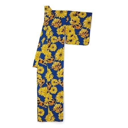 サビ猫の模様は、自然界に馴染む「迷彩柄」の役割も持っています。こちらの浴衣もサビ猫がひまわりに隠れているように見えるので、猫を探して楽しむこともできそうです。